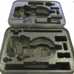 - 弾力があり変形しやすいトムソン刃を型枠に取り付け、プレス機で内装材を型抜きする加工、加工した内装材は貫通していますが、他の形状のものと貼り合わせたり、抜いた部分を一部埋めることにより収納品に合わせた加工が可能です。
